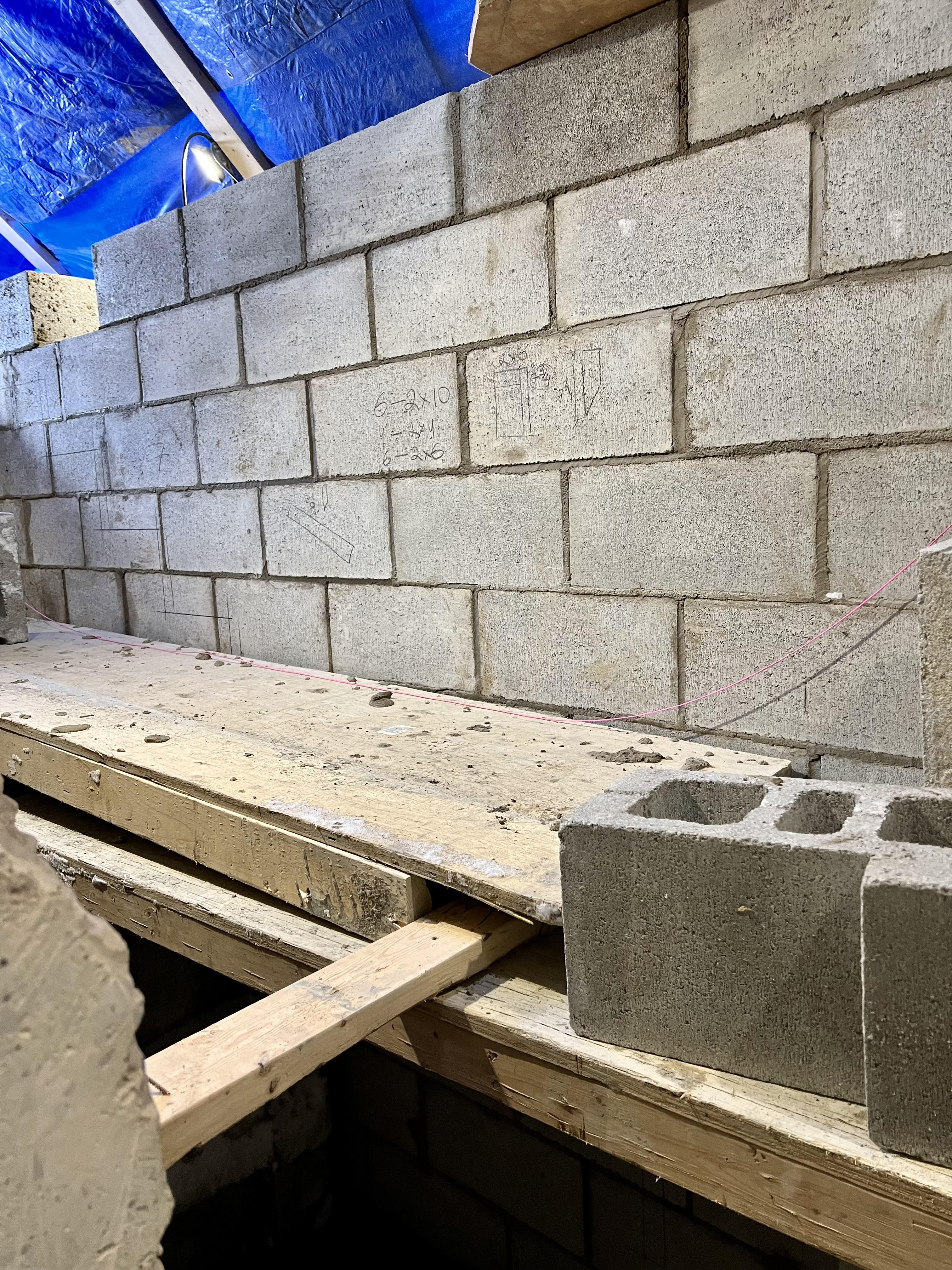 Fresh concrete placed on a basement underpinning wall section. Proper forming, pouring, and curing process documented during active construction.